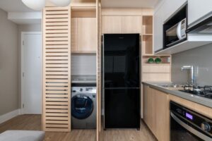 A área social — que integra cozinha, lavanderia e estar — é otimizada com soluções discretas, como o armário ripado que oculta a área de serviço, e um painel com prateleiras contínuas que acompanha a TV, conferindo unidade ao espaço. Um espelho em parede inteira amplia a sensação de profundidade, refletindo a luz natural e revelando os detalhes do décor, como o pendente de esferas brancas e estrutura dourada, que pontua o ambiente com sutileza e personalidade.