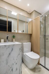 No dormitório, a paleta de cinza e amadeirado continua como fio condutor. A cabeceira em MDF e tecido estofado delimita a área de descanso e traz aconchego, enquanto o guarda-roupa amadeirado e os pendentes dourados equilibram modernidade e calor visual. O banheiro segue a linguagem do projeto, com destaque para a torre em mármore Carrarinha e divisórias ripadas que adicionam privacidade sem pesar no ambiente. O porcelanato cinza e os metais cromados completam a composição minimalista.
