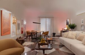 Em sua participação na Mostra, a arquiteta Larissa Galindo propõe um gesto calmo, sutil, porém memorável – seu ambiente convida à desaceleração. Dividido em três espaços integrados – sala principal, hall dos banheiros e lavabo – o projeto nasce do desejo de provocar bem-estar. Na ausência de janelas, Larissa cria uma solução delicada, por exemplo: uma falsa abertura zenital, que simula a luz natural e integra visualmente o verde externo. A natureza aparece não só nos jardins, mas também na paleta de cores, nos materiais orgânicos, nas texturas artesanais e na presença de obras como a tapeçaria que domina a parede do hall. “Para mim, viver com arte é conseguir perceber o extraordinário no ordinário”, sintetiza.