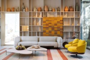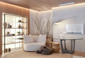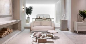 No espaço assinado por Cris Daros para a Mostra, a arte não ocupa um lugar: ela conduz o pensamento. Habita as entrelinhas do projeto como uma partitura silenciosa, onde cada linha, sombra e textura parecem contar uma história íntima – o ambiente reflete uma busca por leveza: formas orgânicas, proporções precisas e materiais naturais compõem um cenário que não grita, mas sussurra. O sofá Nocmii, com curvas generosas e acolhimento tátil, é o fio condutor dessa narrativa, operando como um ponto de repouso e de encontro que organiza a fluidez ao redor. O espaço foi concebido como uma “galeria viva”, onde morar e sentir se entrelaçam. Nada é imposto: tudo convida – ao toque, ao silêncio, à escuta. “Valorizo a escuta atenta”, diz. E o espaço, de fato, escuta. Cada curva, cada respiro no layout, parece ter sido pensado para acolher não apenas o corpo, mas o estado de espírito de quem o visita.