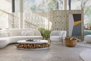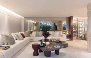 Na intersecção entre o natural e o moldado, Caroline Andrusko propõe uma morada que se lê como paisagem: o espaço não se exibe, ele respira. Para a Mostra, a arquiteta transforma o “Viver com Arte” em gesto essencial, convertendo materiais em linguagem e matéria em silêncio. O ponto de partida é simples e radical: reconhecer na natureza uma estética suficiente: e então, tensioná-la delicadamente com o refinamento do design contemporâneo. O módulo Opus abraça o ambiente com suas linhas generosas; o Austral, comedido, guia o olhar e os movimentos. As mesas de centro Lena e Pandia e a mesa lateral Boyang sintetiza o conceito do projeto: o diálogo entre o bruto e o entalhado, entre a força do mineral e o traço humano. Há quase 20 anos à frente de projetos no Brasil e no exterior, Caroline Andrusko reafirma aqui sua assinatura: uma arquitetura sensível, estratégica e profundamente comprometida com o pertencimento.