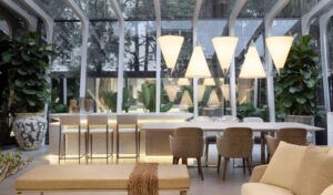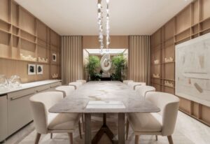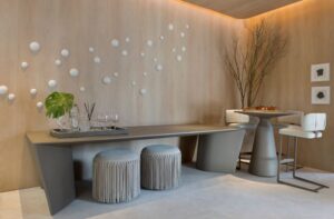 Na contramão da pressa cotidiana, “Aether Haus” sugere uma pausa. Assinado por Fabio Petillo para a Mostra, o ambiente é menos um espaço e mais um estado: de presença, contemplação e leveza. No centro da cena, uma escultura co-criada com o artista João Moro serve de âncora. Não adorna: comunica. É a tradução física de um ambiente que, embora projetado para ser um living com jantar e bar, se assume como santuário contemporâneo. A mesa de jantar Eclipse inaugura o ritmo do espaço: elegante, atemporal, silenciosamente potente. Os materiais, escolhidos com o rigor de quem traduz conceitos em textura, reforçam a busca por transcendência, sendo que a estética não está ali para impressionar, mas para ressoar interiormente. “É uma morada para o que não se vê – sensações, memórias, intuições. É arquitetura como arte viva, feita para ser sentida antes de ser entendida.”