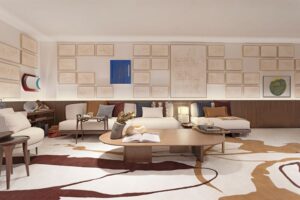 No ambiente assinado por Ester Kloss, escultura e habitar se entrelaçam: tudo foi pensado como se o tempo tivesse esculpido o espaço com as próprias mãos. A referência ao manifesto das belas artes não se apresenta de forma literal, mas sensorial – em tramas, fibras, volumes, texturas. O quarto do casal é mais do que refúgio: é poema tátil. Os móveis Beach & Country não foram apenas inseridos: foram o ponto de partida. Mais do que mobiliário, essas peças representam uma filosofia estética – o luxo despretensioso de quem valoriza o tempo, a origem, a matéria. A cabeceira central, emoldurada pela arquitetura, transforma-se em foco da composição, como se repousar ali fosse também um ato escultórico. “Este espaço é uma escultura habitável”, afirmam. E é exatamente isso: um espaço onde se sente a matéria viva, onde se percebe o gesto do fazer manual e onde a natureza se manifesta no projetual.