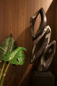 Outro conceito que Soraya Surdi trouxe para o espaço foi a contraposição do lançamento, o sofá Zephyr, com um clássico da Inove, a Slow Chair Vitra. Obras de arte, como a da artista plástica Marilene Zancchett e do escultor Clécius Coser trazem sofisticação. As cores sóbrias ganham conforto com uma iluminação vinda de pendentes e pontos de cores quentes isoladas.