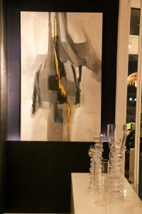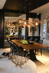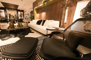 Outro conceito que Soraya Surdi trouxe para o espaço foi a contraposição do lançamento, o sofá Zephyr, com um clássico da Inove, a Slow Chair Vitra. Obras de arte, como a da artista plástica Marilene Zancchett e do escultor Clécius Coser trazem sofisticação. As cores sóbrias ganham conforto com uma iluminação vinda de pendentes e pontos de cores quentes isoladas.