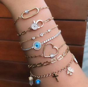 A designer de semijoias Samantha Esser aposta na mistura de várias peças e defende que não tem regras: “Quanto mais, melhor. Afinal, a tendência é misturar para arrasar, criando seu próprio pulseirismo”, afirma Esser.