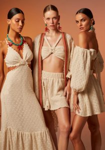 A coleção contempla tops, bottoms, one pieces e overtops também. Barbatanas e estruturas de corselet desenham as curvas femininas em bases de alfaiataria. Recortes estratégicos e micro comprimentos também são pontos fortes para as novas peças. Os acessórios ficam por conta do bag & shoes que completam o catálogo de produtos da marca.