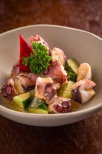 O polvo é cozido lentamente no sous vide e servido em fatias macias e saborosas, acompanhado de lâminas de pepino japonês. Finalizado com um delicado molho à base de missô, é um prato leve, refrescante e marcado pelo umami (R$89).