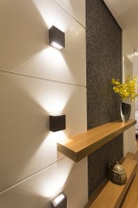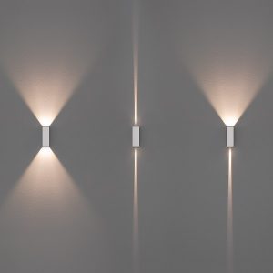Na imagem arandelas apresentam efeitos de fachos “uplight”, “downlight” e de “fio”de luz | Divulgação Yamamura