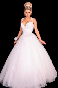 - Curto na frente e longo atrás: Tipo que vem sendo muito usado no momento da valsa, os modelos curtos na frente e longos na parte de trás misturam tradição e elegância e agradam a todos. As caudas longas ficam lindas para o momento da dança clássica.