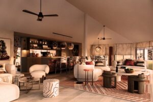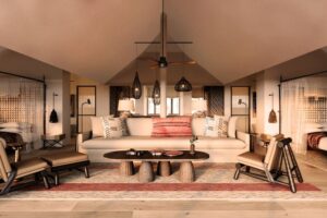 As acomodações individuais em tendas, incluindo uma tenda familiar que pode receber até 4 pessoas, contarão com uma sala de estar espaçosa em estilo suíte, incorporando grandes janelas e terraços que oferecem vistas panorâmicas da paisagem ao redor e trazendo o exterior para dentro. A área de fogueira aberta e o bar do acampamento continuarão a oferecer espaços centrais para reuniões sociais após as experiências de safári, ou para simplesmente relaxar e apreciar a vida selvagem da savana.