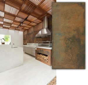 | Iron EXT 60 x 120 cm: A superfície cerâmica se inspira no efeito imponente e robusto do aço corten já em fase de oxidação. Em tonalidades marcantes e modernas, as peças transmitem um quê de reverência às marcas deixadas ao longo dos anos, mas com muita contemporaneidade;