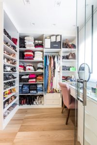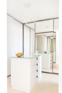 Ilhas – oferecem uma bancada de apoio e até espaço para gavetas e compartimentos, dependendo da peça escolhida, uma ilha no closet cria mais possibilidades de organização, principalmente quando executadas em marcenaria inteligente para personalizar as medidas e repartições. Na ocasião, a arquiteta Ana Rozenblit aproveitou o espaço vazio entre os armários para erguer uma ilha com gavetas e gavetões, utilizando a mesma tonalidade na marcenaria de todo o cômodo.