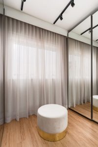 Pufes: são peças auxiliares para quando é necessário se sentar, principalmente para o calçar e experimentar os sapatos. O mobiliário também pode servir de apoio para peças de roupa, descanso, apoio e muito mais! No ambiente da arquiteta Ana Rozenblit, ela combinou um grande pufe rosa com um tapete felpudo pra lá de confortável.