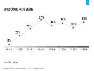 A porcentagem de lojas que utilizaram frete grátis como estratégia apresentou leve variação durante o ano de 2018. Ao analisar os dez maiores players do mercado, esse aumento acontece em dois momentos: no segundo e no quarto trimestre do ano devido à greve dos caminhoneiros e período de Natal (que inclui Black Friday), respectivamente.