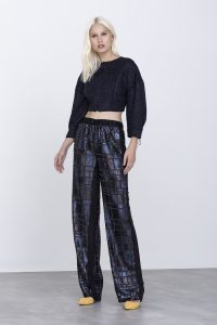 Para as mais ousadas, peças trabalhadas em paetê preto e azul delimitados por miçangas criam a padronagem xadrez de maneira inesperada. Apresentado em opções de calça, camiseta e vestido, o tecido é ideal momentos noturnos.