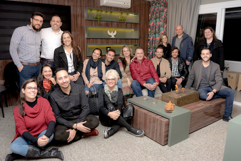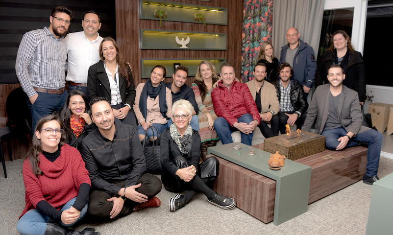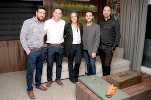 Paulo Bruzon (gerente regional da Eucatex), Fabio Marinho (gerente nacional da Eucatex), Claudia Esteves Bessani (comercial de vendas da Eucatex), o Designer Diego Miranda Leite e o Arquiteto Zeh Pantarolli. Foto: Lorraine Lopes