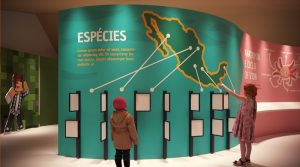 Ainda nesse ambiente, terão a oportunidade de tocar e compreender o ambiente e as características do animal por meio de um diorama tátil, em um totem central, e elementos táteis do ciclo de vida. Ao conhecer características da espécie, o visitante será transportado ainda no ambiente para o questionamento sobre quais as ameaças que tornam a espécie em perigo de se extinguir na natureza, por meio de painéis temáticos.